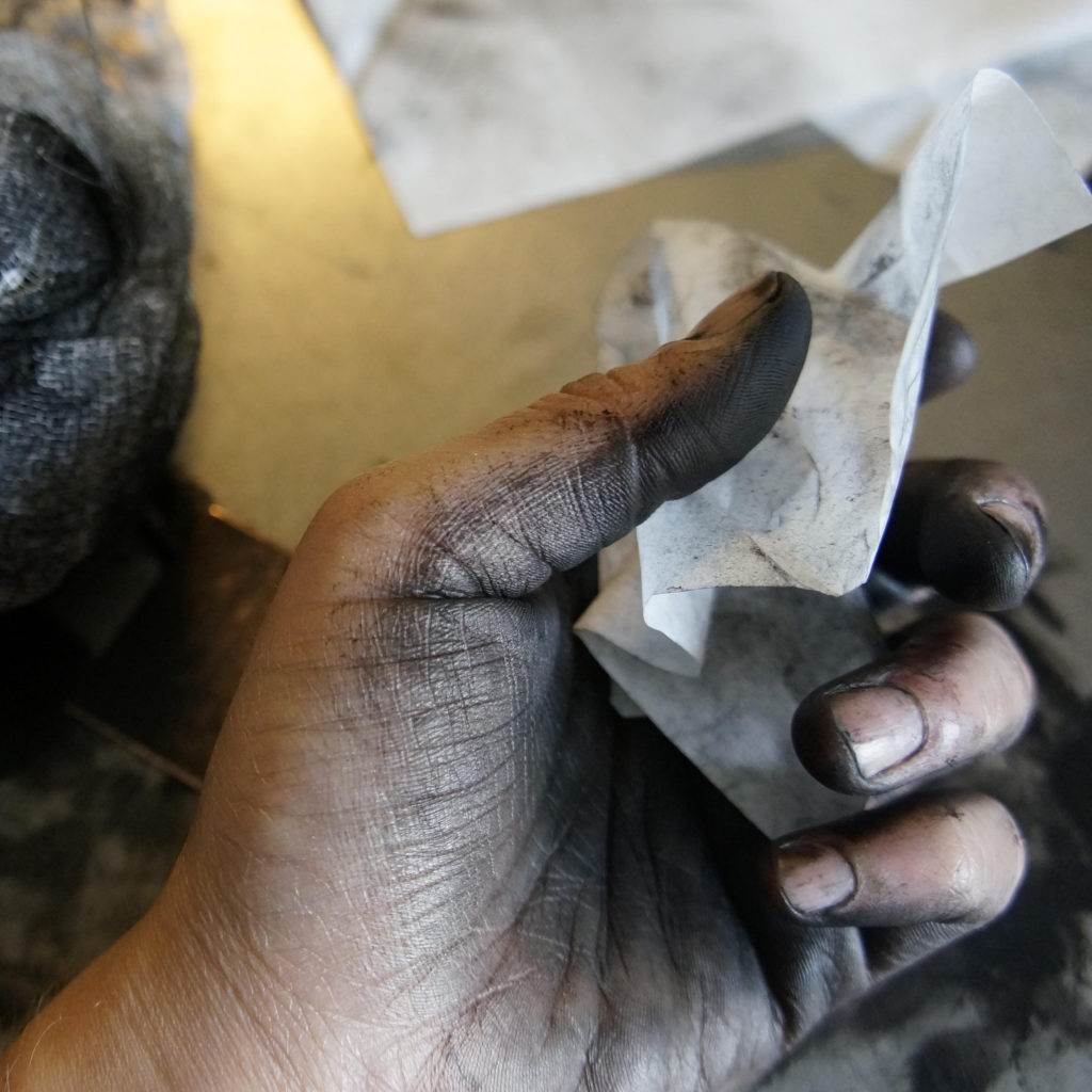 L’héliogravure au grain est un procédé photomécanique créé au XIX° siècle, par Nièpce, Poitevin, Talbot et porté à maturité en 1876 par Karl Klic. Inscrite dans le monde de l’estampe et de la photographie, l’héliogravure présente des noirs d’une profondeur presque palpable, des densités de gris d’une grande subtilité qui ont séduit des photographes illustres tels qu’Alfred Stieglitz ou Edward Curtis. Pour Marie Levoyet, l’héliogravure est un cheminement nourri de la rencontres avec les artistes, de l’histoire des images, du cuivre, de l’encre, des matières, des gestes et de la lumière, Helio en grec ancien.