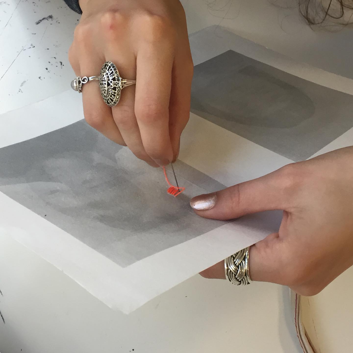 “ Je déjoue ce savoir-faire. Je confronte technique, matières et sujets pour révéler des images sur des matériaux parfois peu communs en broderie traditionnelle. Un dialogue émerge alors entre ce qui est représenté et l’objet support. La broderie fait acquérir à ces objets une nouvelle dimension artistique en les détournant de leur usage initial. Par ce geste, je réinterroge leur valeur, leur mode de fabrication et leur temps de réalisation. Je leur offre une nouvelle histoire.”
